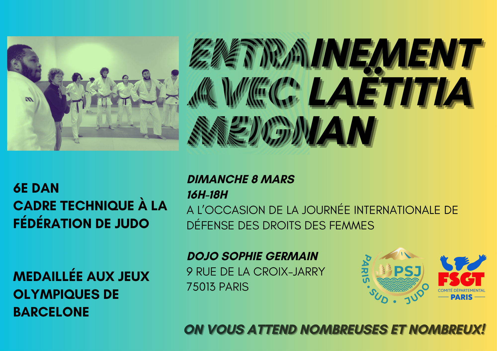 1h entre filles puis cours mixte (ne waza). Entrainement ouvert à toutes les judoka intéressées, licenciées au PSJ ou ailleurs ! Bienvenue !